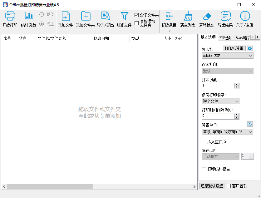 可批量打印并统计页数(也可仅统计页数),还可使用PDF虚拟打印机将Office文档转为PDF文档;支持双面打印、页边距、缩放页面、打印指定页等功能,且可以针对某类或某些文档单独设置;打印完可生成打印报告;可统计PDF文件页面尺寸(企业版功能)。